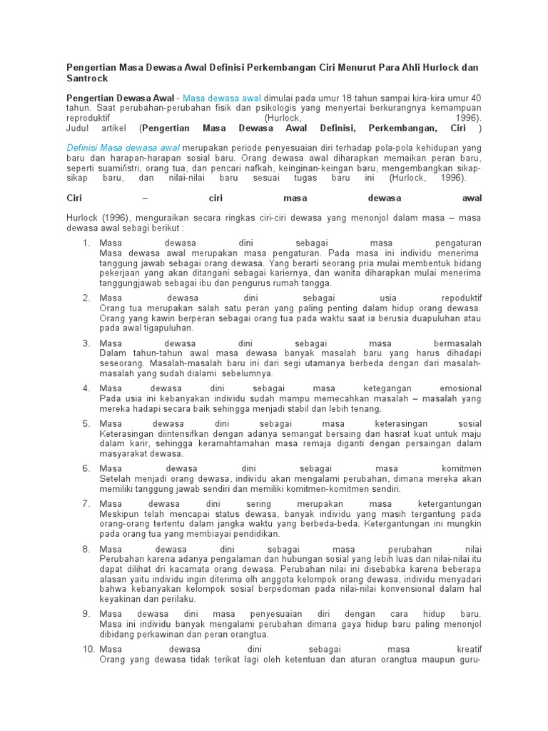 Perkembangan fisik dilihat dari aspek perkembangan fisik, pada awal masa dewasa kemampuan fisik mencapai puncaknya, dan sekaligus mengalami penurunan selama periode ini. Mau belanja tinggal buka handphone, mau. Perkembangan masa remaja usia 11 12 18 tahun jurnal perkembangan masa dewasa awal pdf, hurlock 1990 membagi masa remaja menjadi dua yaitu masa remaja awal 11 12 16 17 tahun dan remaja akhir 16 17 18 tahun pada masa remaja akhir individu sudah mencapai transisi. Pada masa awal kemerdekaan sampai masa demokrasi liberal. Sebagian besar golongan dewasa muda telah menyelesaikan pendidikan sampai taraf universitas dan kemudian mereka segera memasuki jenjang karier dalam pekerjaannya.
