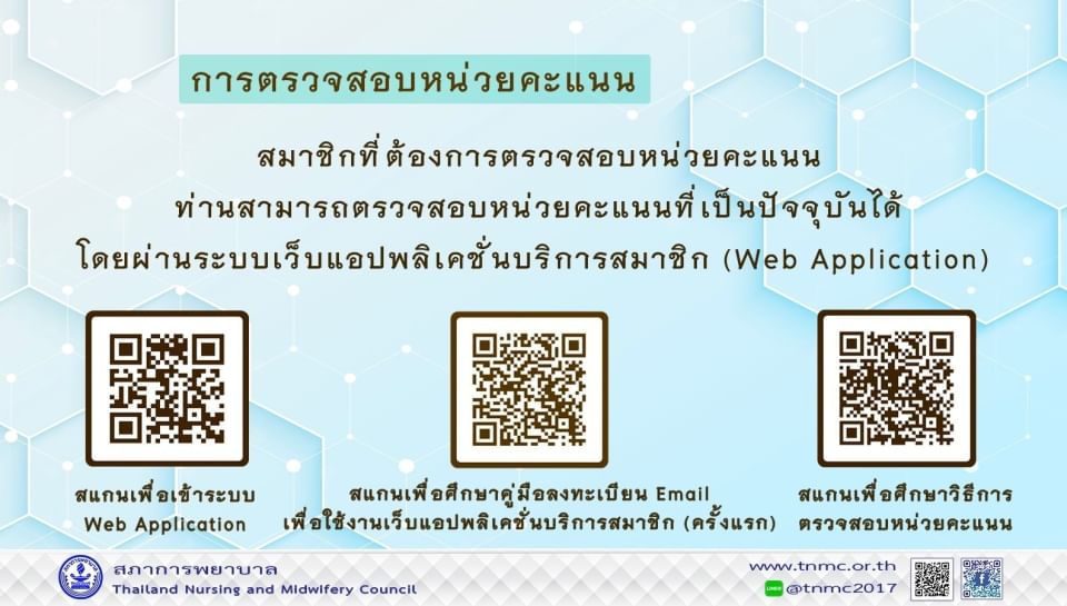 สมาชิกที่ต้องการยื่นคำร้องขอต่ออายุใบอนุญาตฯ และคำร้องอื่นที่หน่วยทะเบียนฯ ให้ยื่นผ่านระบบ web application แล้วพิมพ์แบบคำขอส่งมาที่สภาการพยาบาล. ประกาศสภาการพยาบาล เรื่อง การกำหนดกิจกรรมการศึกษาต่อเนื่องและการกำหนดหน่วยคะแนน 23 กันยายน 2556: การลงทะเบียนเพื่อเก็บหน่วยคะแนน การศึกษาต่อเนื่องสาขาพยาบาลศาสตร์ ด้วยการศึกษาด้วยตนเองจากบทความวิชาการ เล่ม 2 พ.ศ. น้อย 50 คะแนนใน 5 ปี และมีหลายช่องทางเก็บหน่วยคะแนน เพื่อให้ทุกคนเข้าถึง. เนื่องจากการประชุมคณะกรรมการแพทยสภา เมื่อวันที่ 12 กรกฎาคม 2544 มีมติว่า จะไม่ใช้การสอบเป็นเงื่อนไข เมื่อเก็บสะสมคะแนนได้.